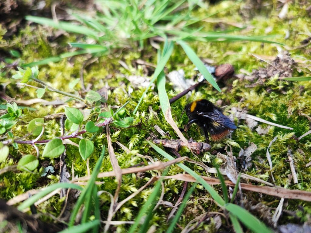 Schlehen (Prunus spinosa), die sonst zahlreich vertreten sind, waren bei unserem Besuch noch nicht in Blüte. Auch die kräftig orangefarbenen Pollenhöschen passen nicht ganz zu Krokussen, die man mitunter in der Blüte sieht. Letztlich zeigt sich hier einmal mehr: Bienen finden ihre Quellen – auch wenn wir sie nicht immer direkt erkennen.