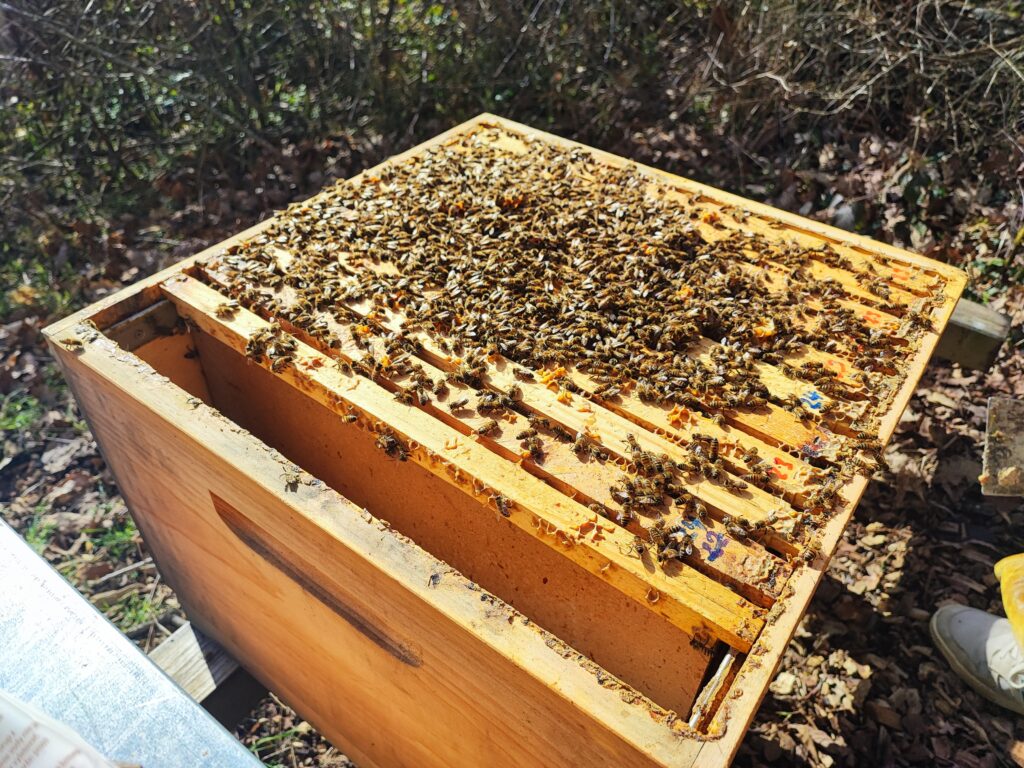 Mit den ersten wärmeren Tagen – rund 15 °C – zeigte sich schnell: Die meisten Völker sind gut durch den Winter gekommen. Schon beim ersten Öffnen war deutlich zu sehen, dass viele Bienen unterwegs sind.